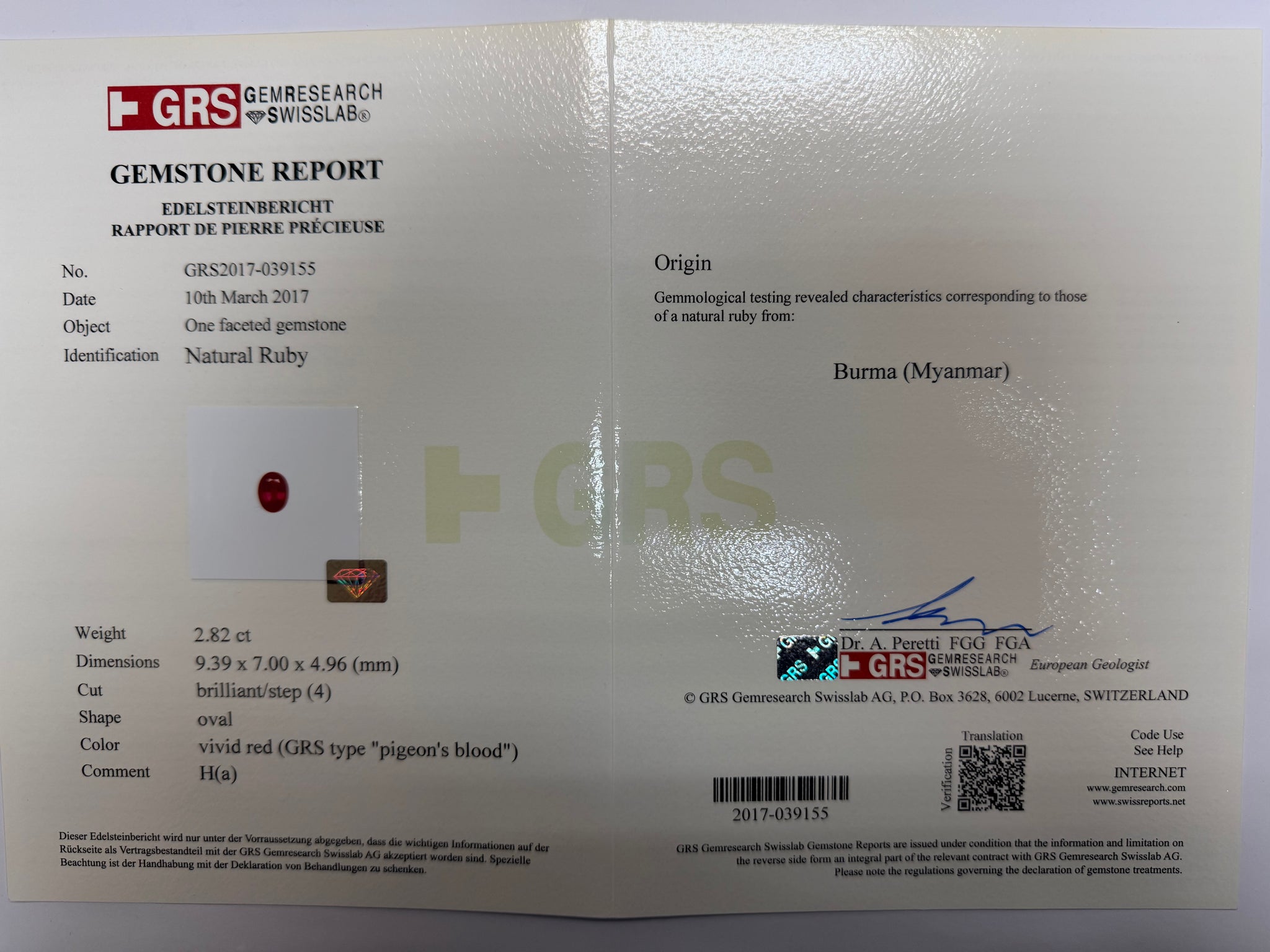 Natural Ruby in oval shape certified by GRS, with thermal treatment [H(a)], vivid red (GRS type “Pigeon Blood”), Burma origin