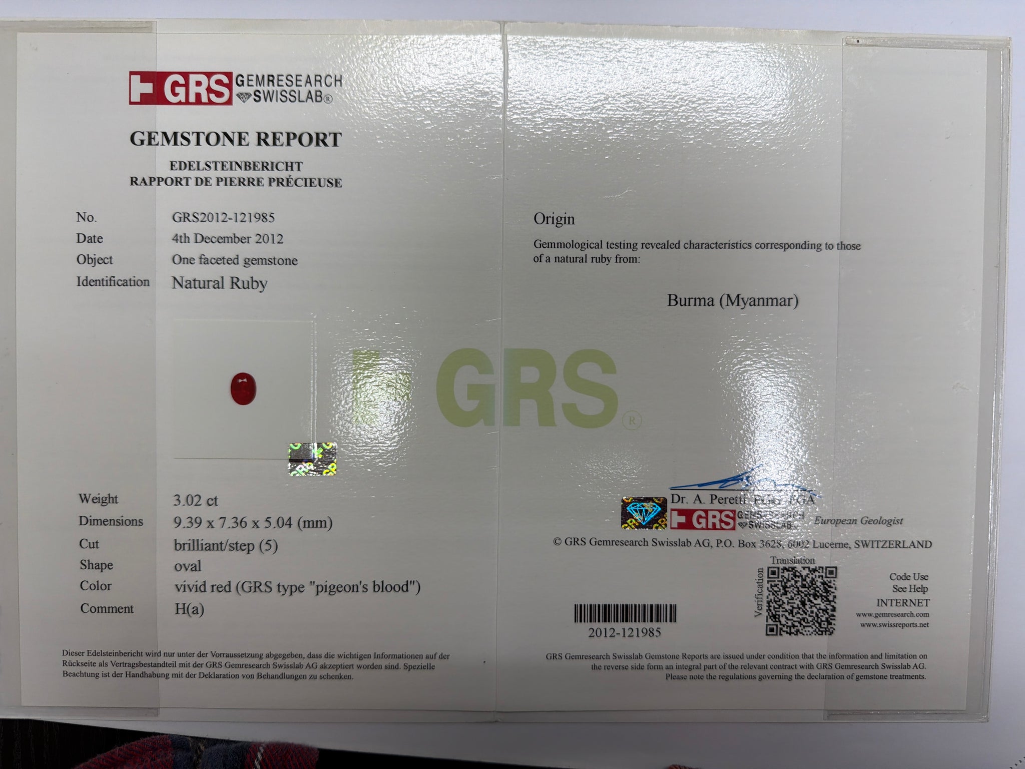3.02cts oval shape natural ruby certified by GRS with thermal treatment (Ha), Burma origin, vivid red ( GRS type “pigeon blood”)
