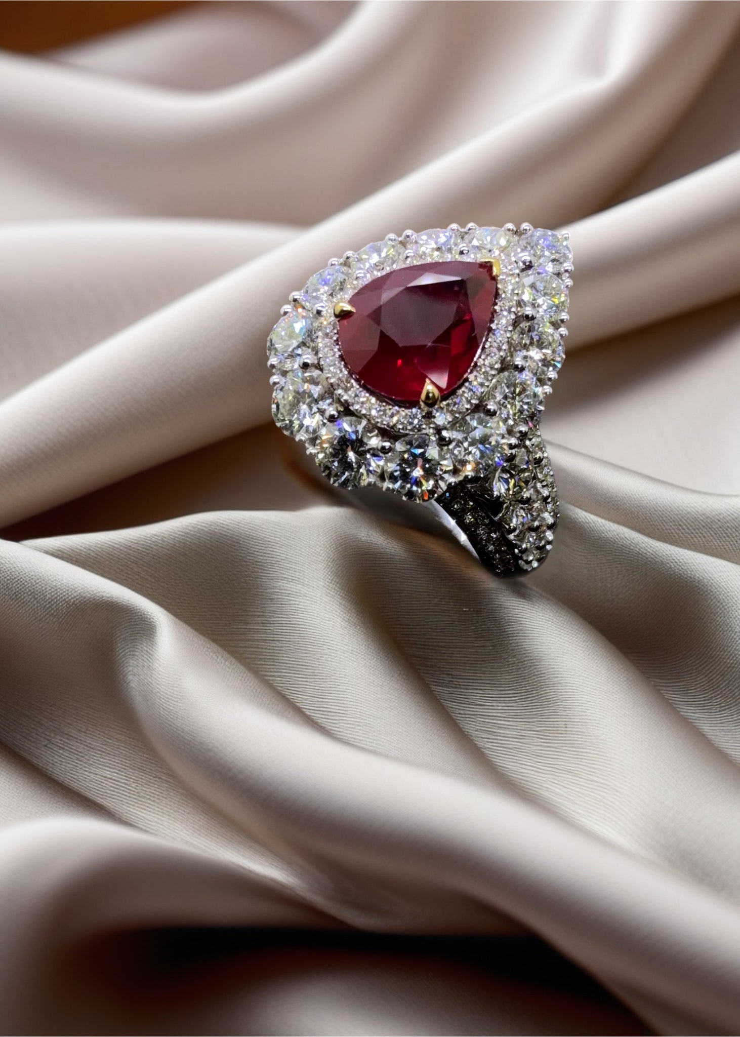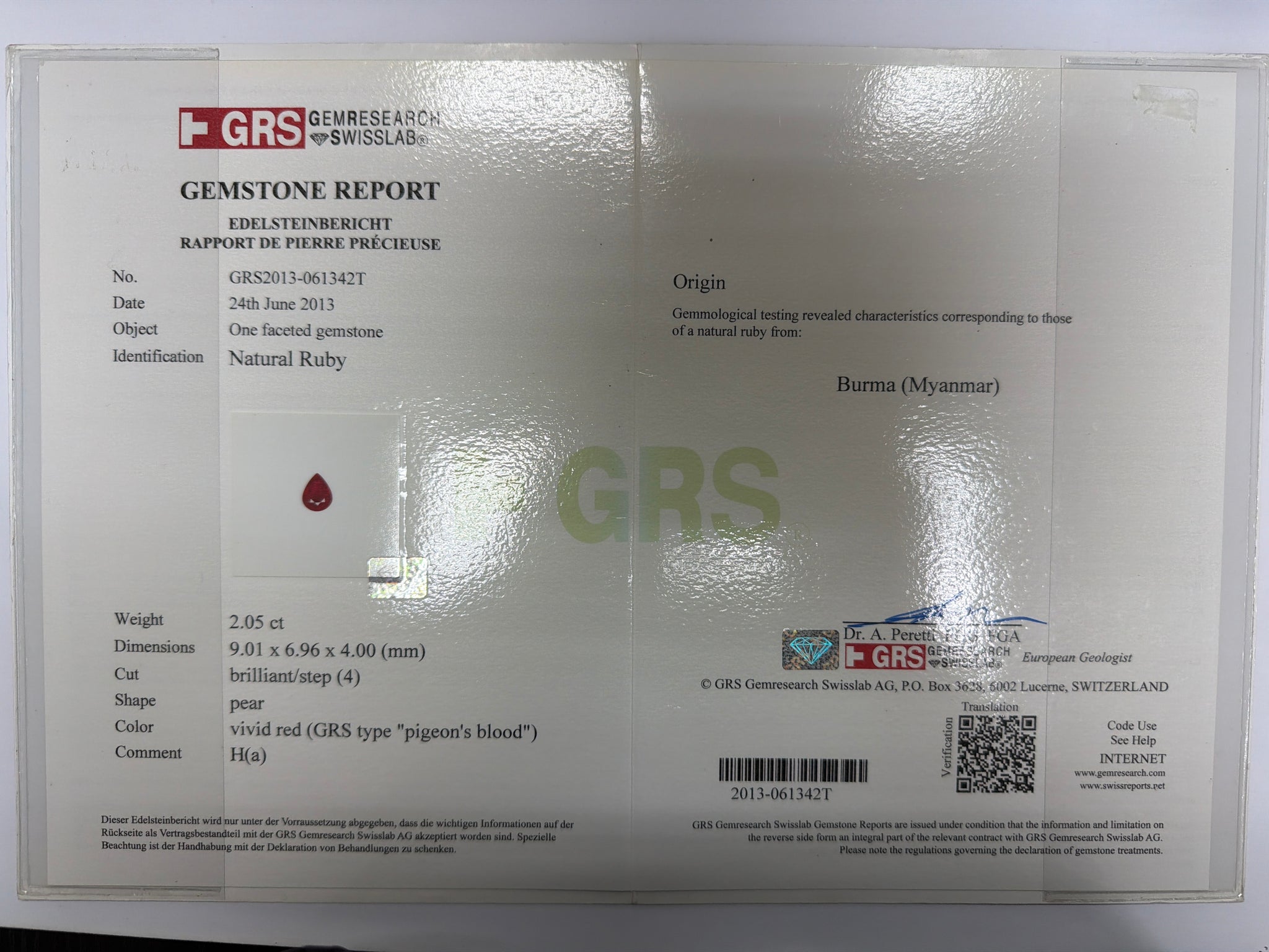 Natural Burmese ruby 2.05cts in pear shape certified by GRS Laboratory with thermal treatment [H(a)], vivid red.