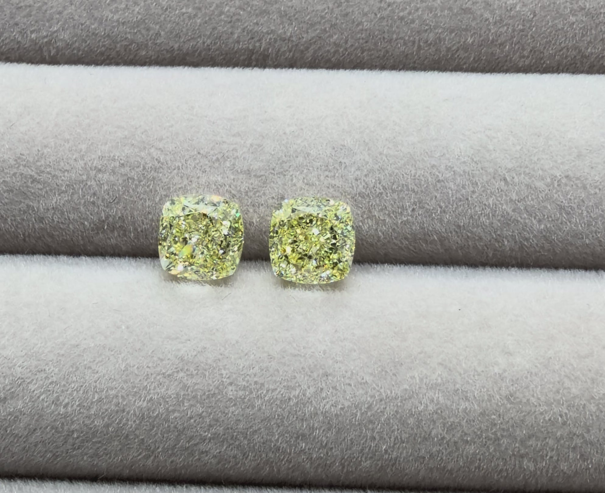 Unmounted perfect-matched cushion shape natural fancy yellow diamonds, 1.72cts with clarity in IF and 1.70cts  with clarity in VS1 respectively. Both are excellent in polish and very good in symmetry.